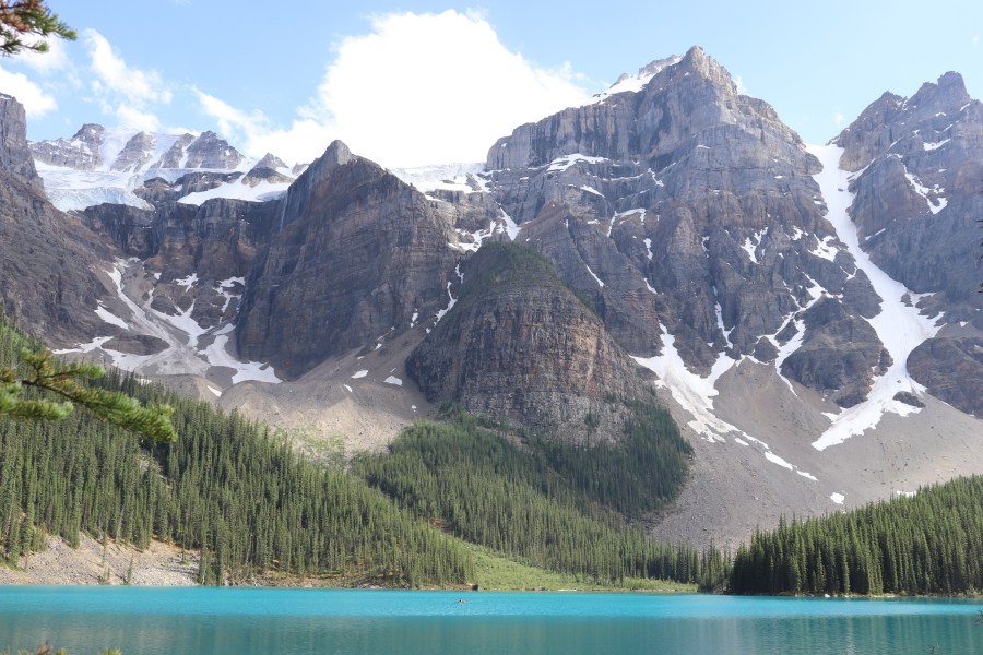 Moraine Lake once the sun cooperated. Huge Glacier in upper left corner.