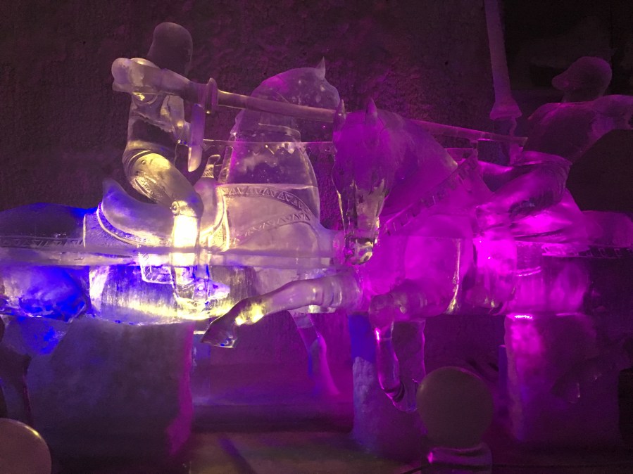 The humans took another trip with out me and headed up to Chena Springs. While there they went to an Ice Museum. This was a cool sculpture showing two men on horseback jousting. This piece was about 8 feet tall.