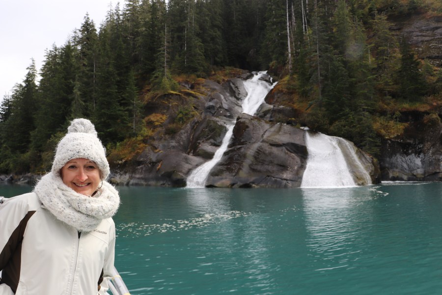Mommy in front of a pretty waterfall