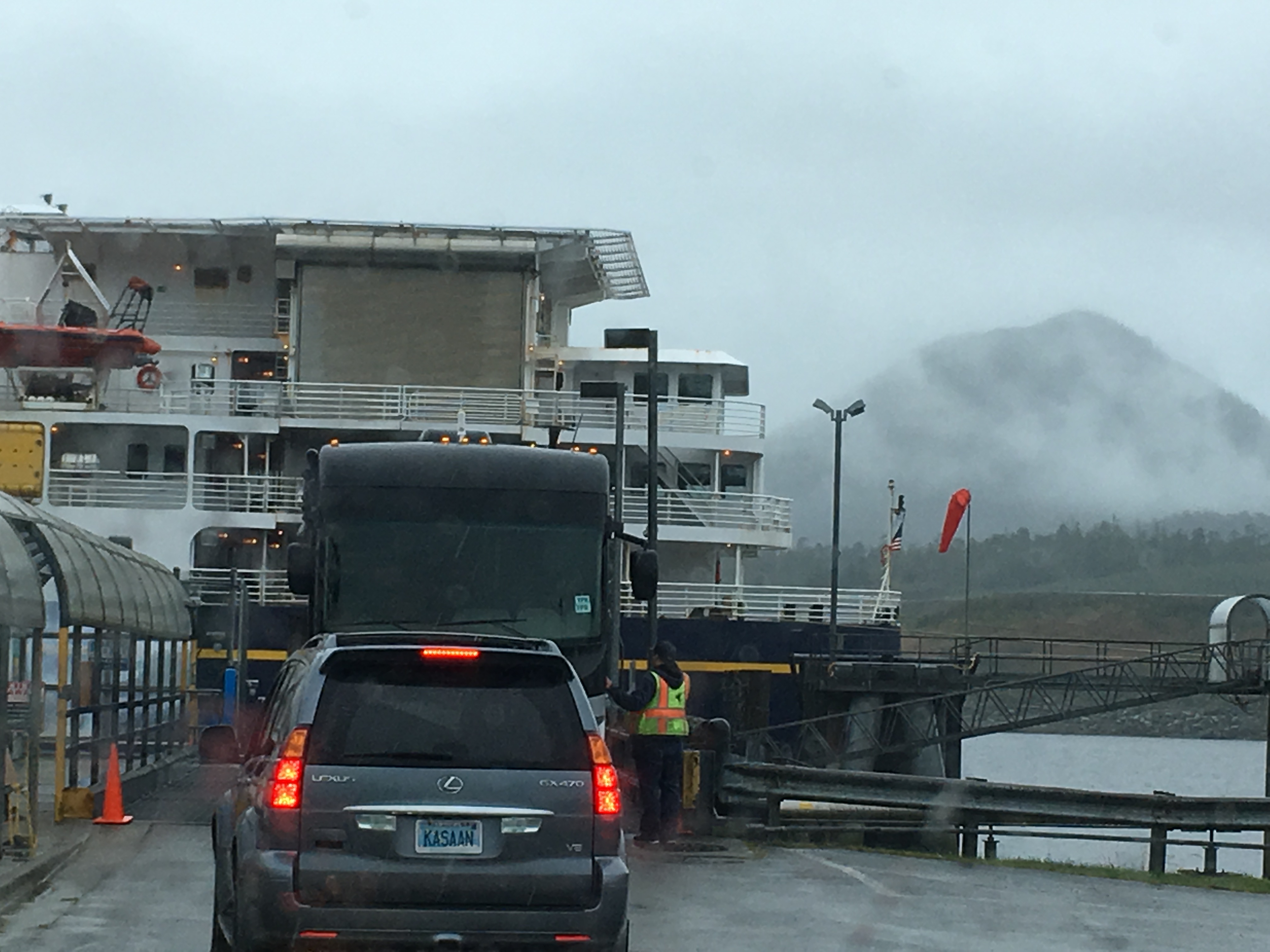 Rhonda snapped this photo showing how we had to back the RV on to this smaller ferry. Was definitely an experience.